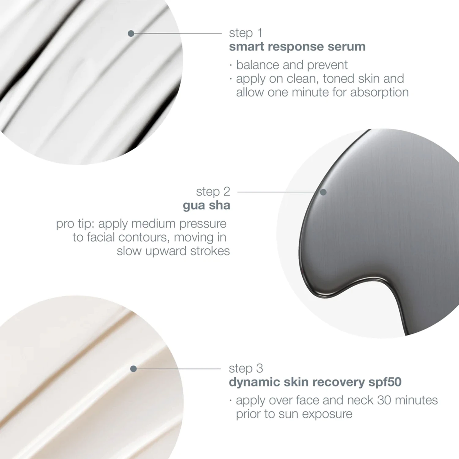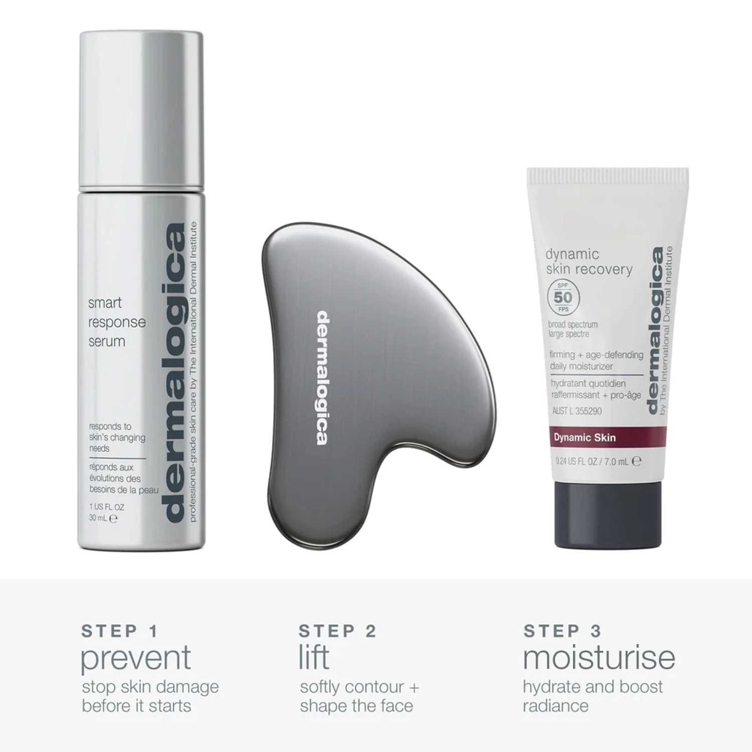 Your serum just got smarter: Smart response serum uses four actives that act when triggered to hydrate, brighten, soothe, and address the appearance of fine lines and wrinkles. Protect and hydrate with Dynamic Skin Recovery SPF50 moisturiser then smooth + contour with the included Gua Sha.