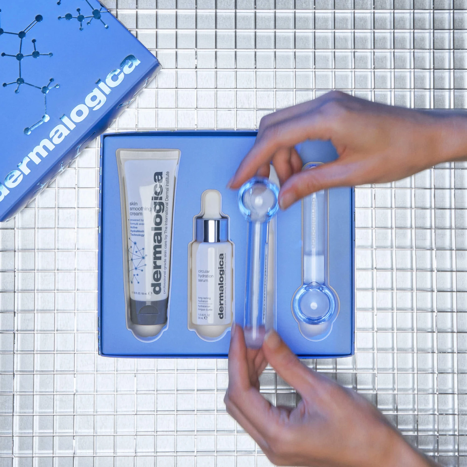 This moisturising kit quenches dehydrated skin and supports long-lasting hydration. Kick-start skin’s hydration cycle and replenish skin from within with Circular Hydration Serum. Follow-up with our best-selling Skin Smoothing Cream to lock in moisture all day. Refrigerate Cooling Globes for a treatment room experience, at-home.