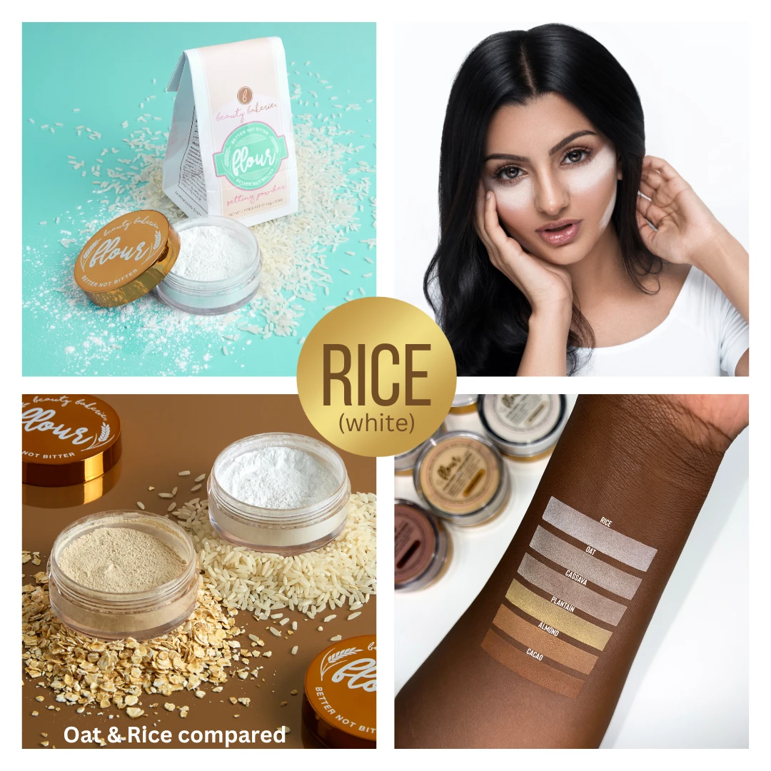 Our finely-milled, gluten-free, vegan, Rice (White) Flour Setting Powder allows you to set your concealer and foundation in place for a long day’s wear. This amazing,lightly tinted (barely-there) formula puts the oily face battle to rest. With an HD feature, it will noticeably blur your pores and soften your complexion leaving you with a beautiful, matte finish.Plus, the jar’slock mechanismprevents product from spilling out – so you can bake withevery.last.bit!
